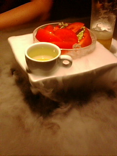 居酒屋は凄いね~。 トマトがドライアイスと出てきたよ~。 詳しくはフラッシュガンの ブログをチェクチェクチェックよ~。 Eiji