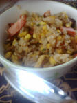 カニチャーハンのもと に焼き豚も入れたら 謎なものが 完成しました。 しかも塩胡椒入れすぎた! しっぱい!しょっぱい!