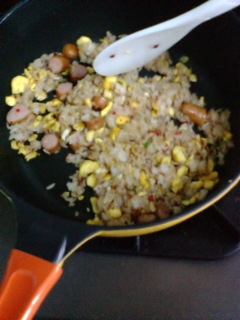 チャーハンの素だけでは味が薄い! という事で塩コショウしたら うまくいった! ウィンナーも入れたけどね~。 eiji